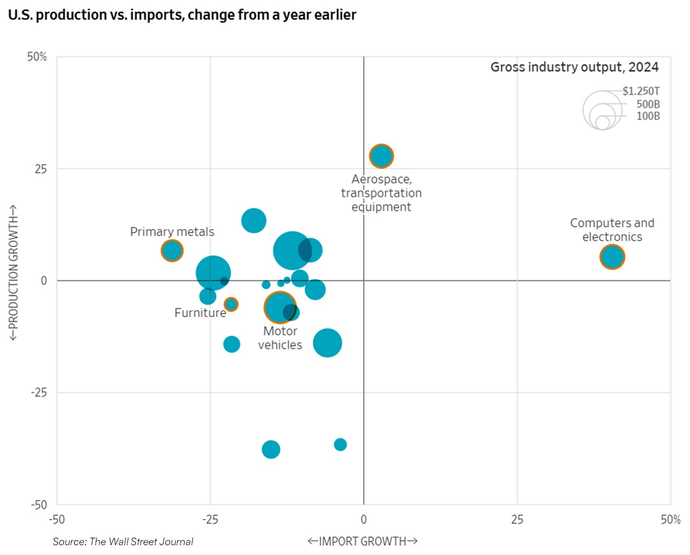 Amid all these aggressive industrial maneuvers, the Wall Street Journal published a timely article on America’s “stealth manufacturing boom.” To be sure, it’s very early days; semiconductors (arguably the most pivotal industry in the world at the moment) remain skewed toward foreign reliance; and nothing about this strategy guarantees that US citizens will necessarily get richer in real terms even if it works, but the playbook looks increasingly clear by the week.