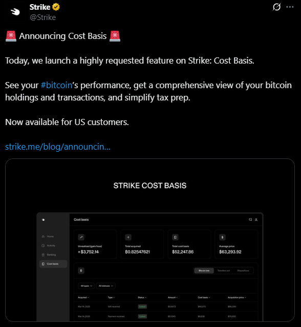 Strike rolled out a more detailed dashboard for tracking cost basis data: