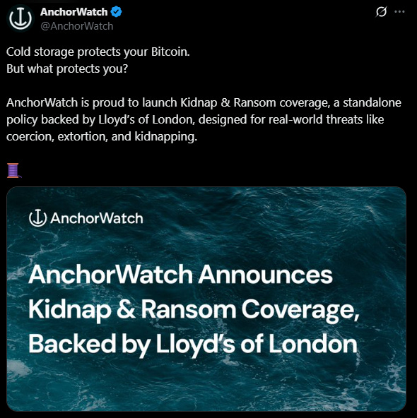 AnchorWatch announced it now offers K&R coverage on top of its unique, industry-leading 1:1 bitcoin insurance policies: