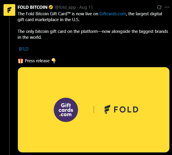 Fold also announced that its bitcoin gift cards are now live on giftcards.com, one of the most active gift cards sites in the world: