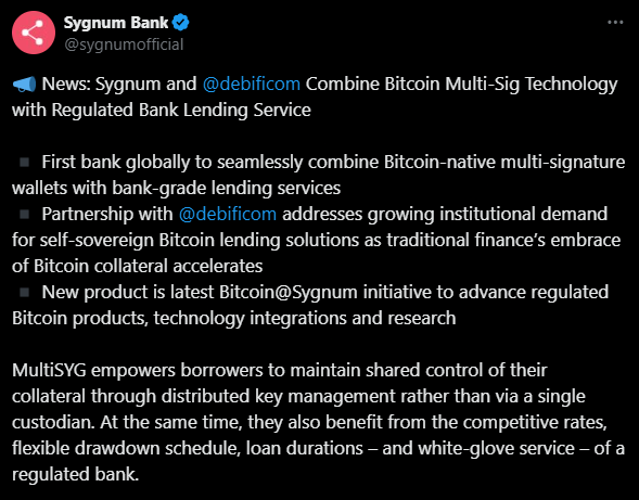 Debifi announced a new partnership with Swiss Bank Sygnum to offer bank-grade bitcoin-collateralized lending secured by Debifi’s multi-sig custody platform: