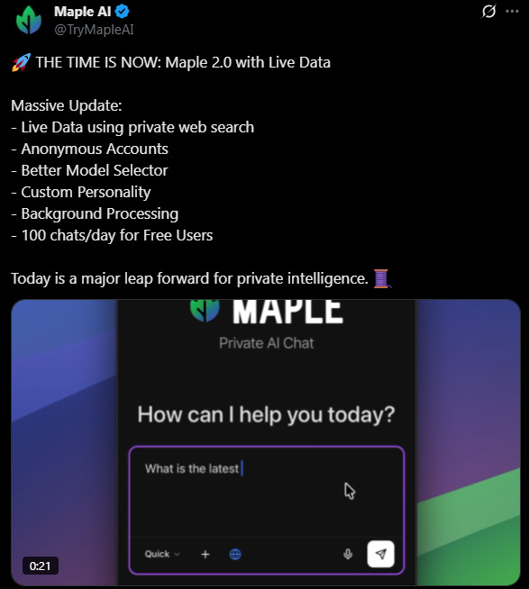 Maple AI rolled out Maple 2.0, a major new update with new features including live data capabilities: