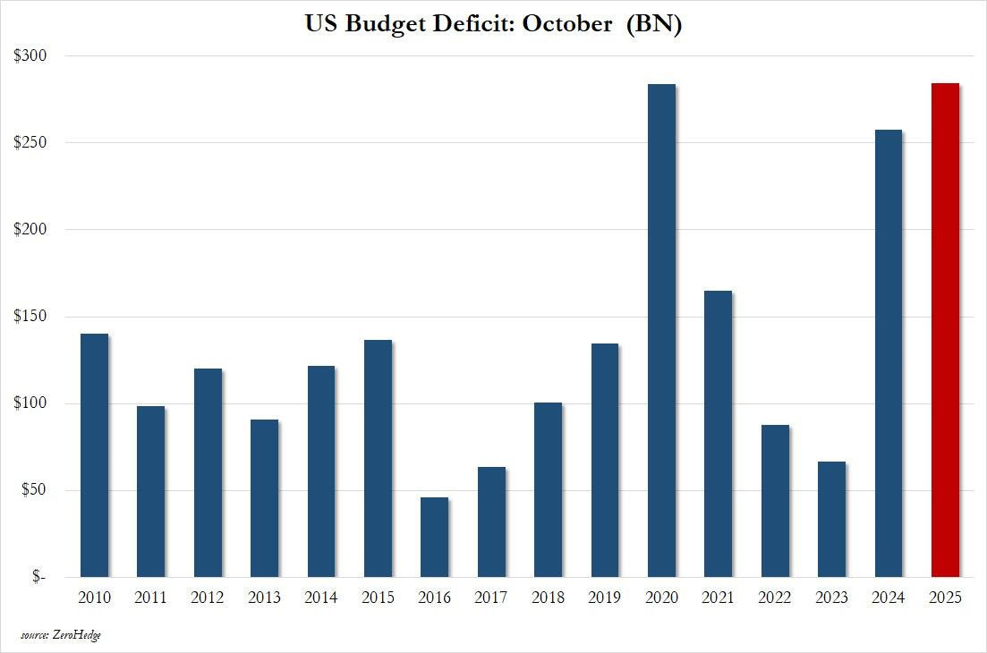 Either way, assuming the Fed wants to avoid more aggressive balance sheet action and hedge funds are mostly tapped out, such a move will likely become important sooner than later, as the October 2025 federal budget posted the largest October deficit in history despite a surge in tax receipts and tariff income.