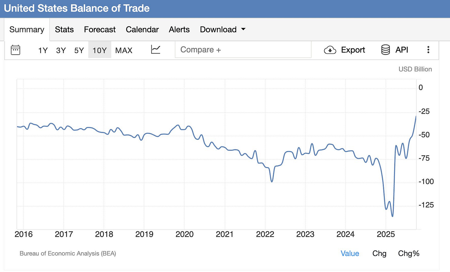 More encouragingly, the Atlanta Fed’s GDPNow indicator is now pointing to 5.4% growth in Q4, though this appears to be largely an artifact of much higher net exports Y/Y as the latest US trade deficit figures came down dramatically. This trade deficit headline by itself requires a few major qualifications including collapsing pharma imports (reversing some frontrunning earlier this year) and large gold exports.
