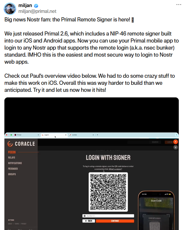 Primal released version 2.6 of its flagship app, which now includes an innovative remote signing flow for all Nostr apps: